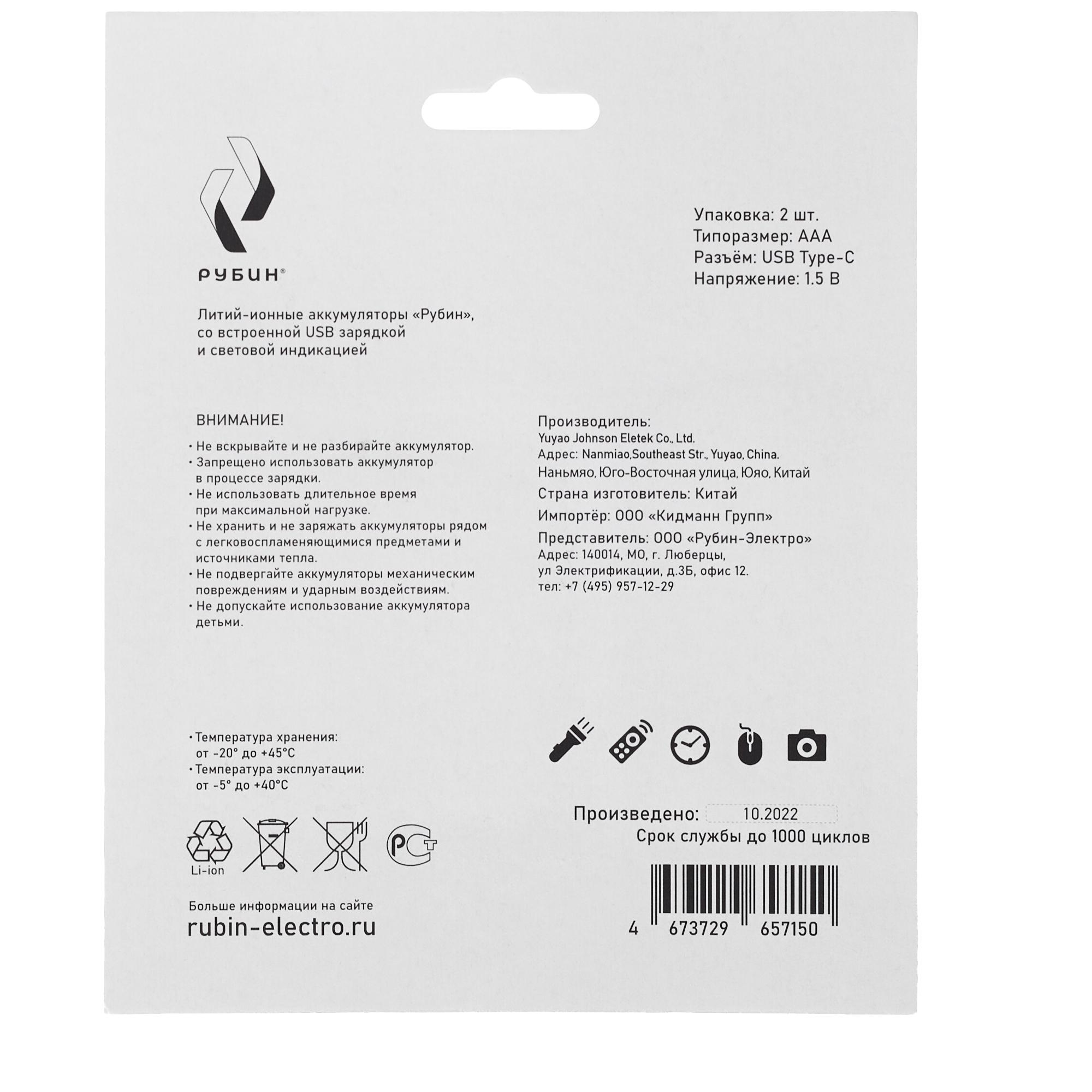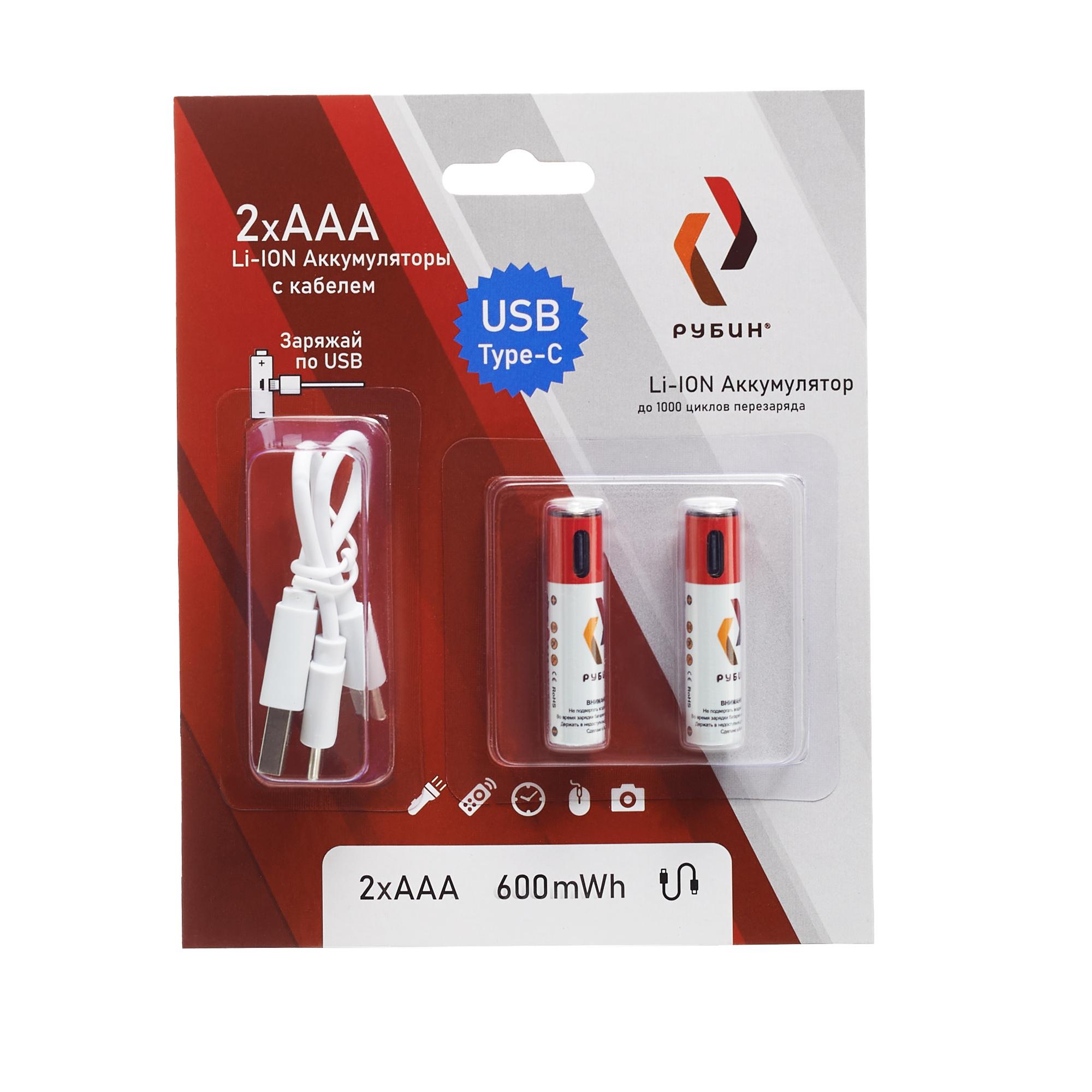 ААА600 Type-c блистер с кабелем 2шт Аккумуляторные мизинчиковые батарейки Рубин Li-ion ААA 1,5v 600 mWh с Type-c зарядкой: экологичная и экономичная замена мизинчиковым батарейкам. Продаются в упаковке по 2 штуки с кабелем для зарядки. Аккумуляторные батарейки Рубин решают проблему питания любых устройств, работающих от мизинчиковых ААА-батареек. Аккумулятор выдерживает до 1000 циклов зарядки: один аккумулятор заменяет 1000 батареек! Чтобы зарядить Рубин Li-ion ААA 1,5v 600 mWh, достаточно любого USB (5В) источника питания. В корпус аккумулятора уже встроен Type-c разъем, как в большинстве современных смартфонах — аккумулятор будет полностью готов к использованию через 1,5 часа. Больше никаких зарядных устройств, проводов и выброшенных батареек, вредящих экологии! • Заряжается через любой USB-выход • До 1000 циклов заряда/разряда • Встроенный LED-индикатор • Автоматическое отключение при полном уровне заряда • Вес: 10 г, размеры: 10 x 44 мм • Время зарядки: до 1,5 часов • Ёмкость: 400 мАч, 1.5 В (60-80% от обычной одноразовой батарейки) • Условия работы: от 0 до +45°С, 10—85% RH • Условия хранения: от -10 до +60°С, 10—85% RH • Ток заряда: 400 мА; сила тока: 30 мА—400 мА Применяются в: 1. Детские интерактивные игрушки 2. Игрушки на радиоуправлении (кроме игрушек с бесколлекторным двигателем и приборов, требующих большой «пусковой ток») 3. Карманные фонарики 4. Пульты дистанционного управления. 5. Настенные часы 6. Домашние электроприборы. 7. Портативные аудио-видео устройства. 8. Носимые устройства связи (радиостанции, walkie-talkie).