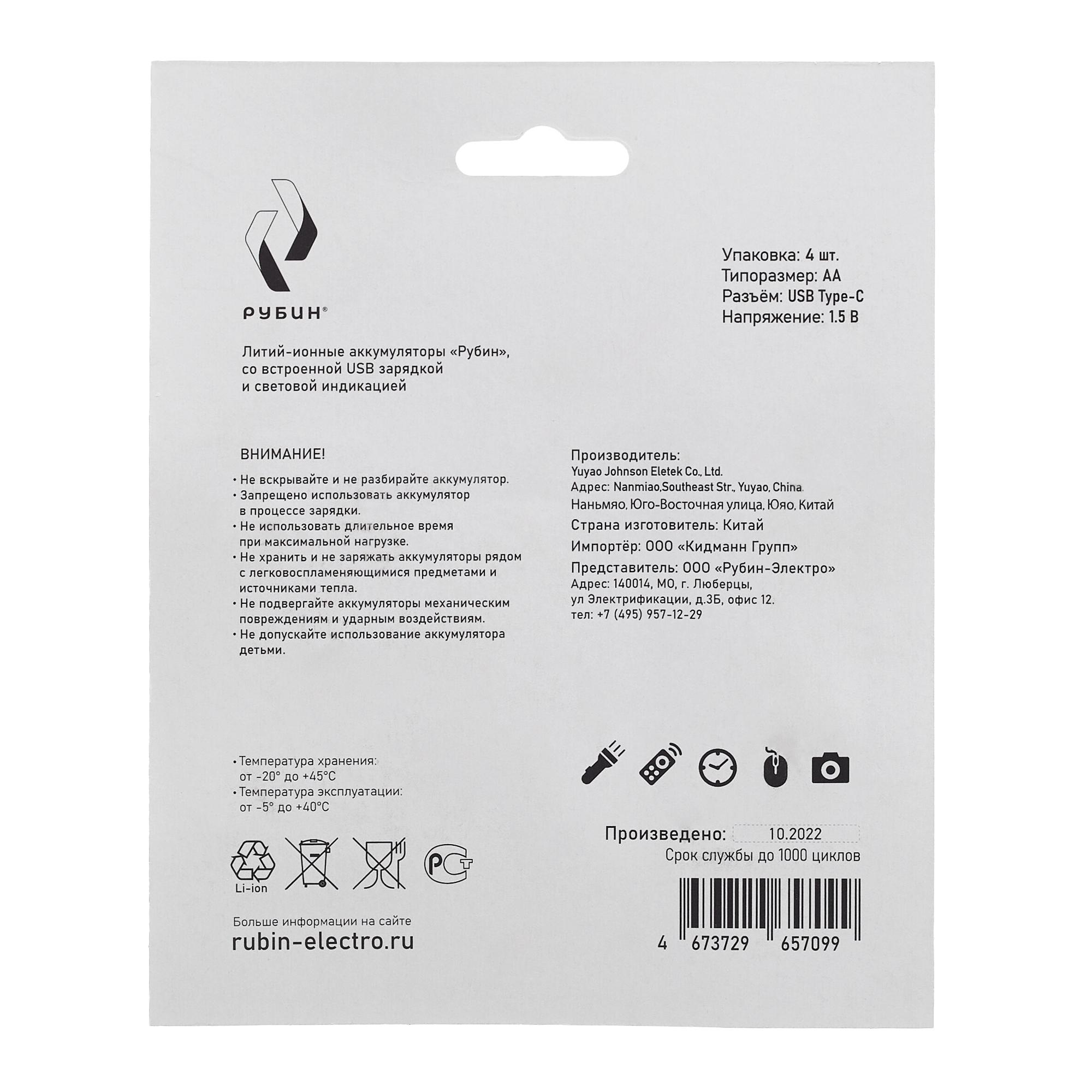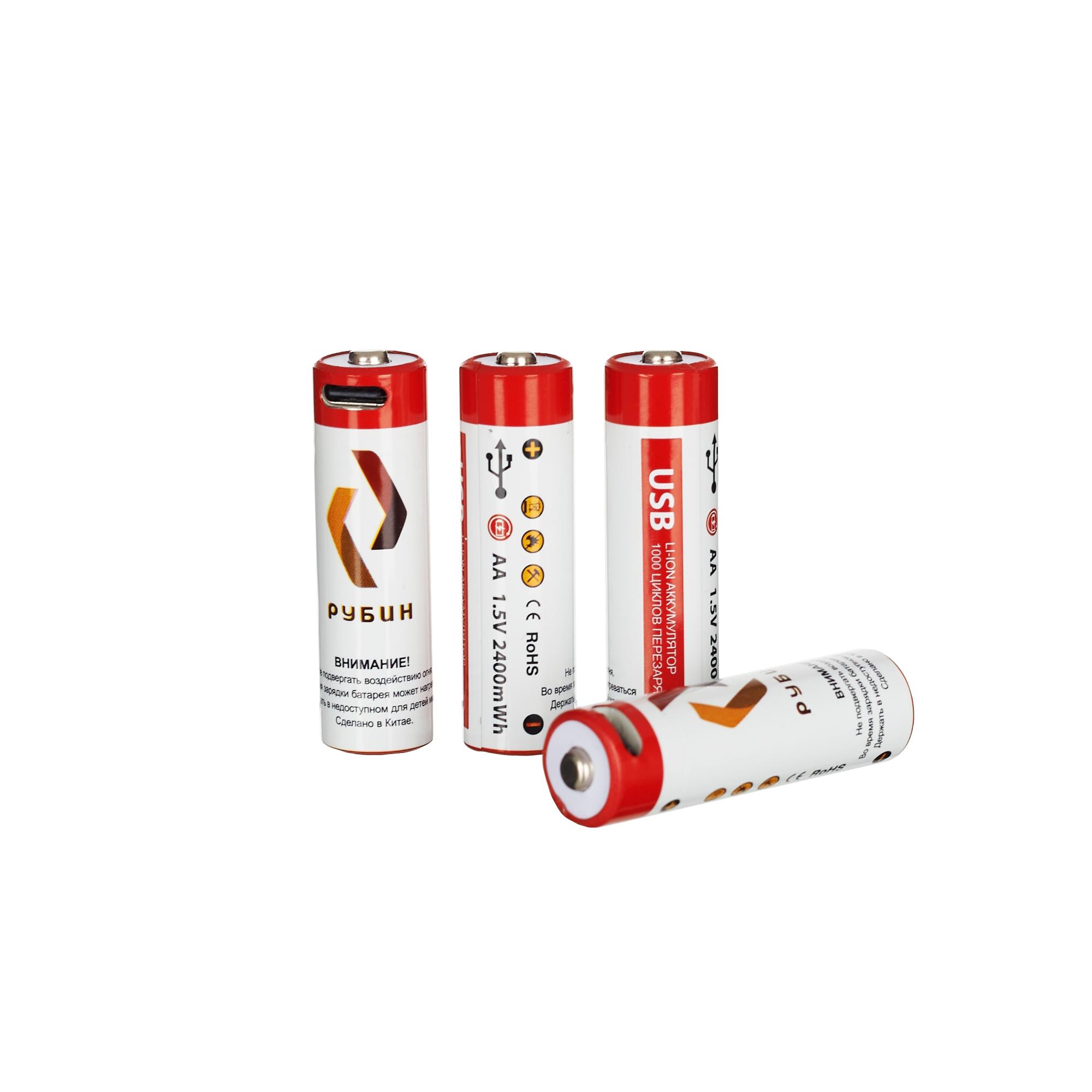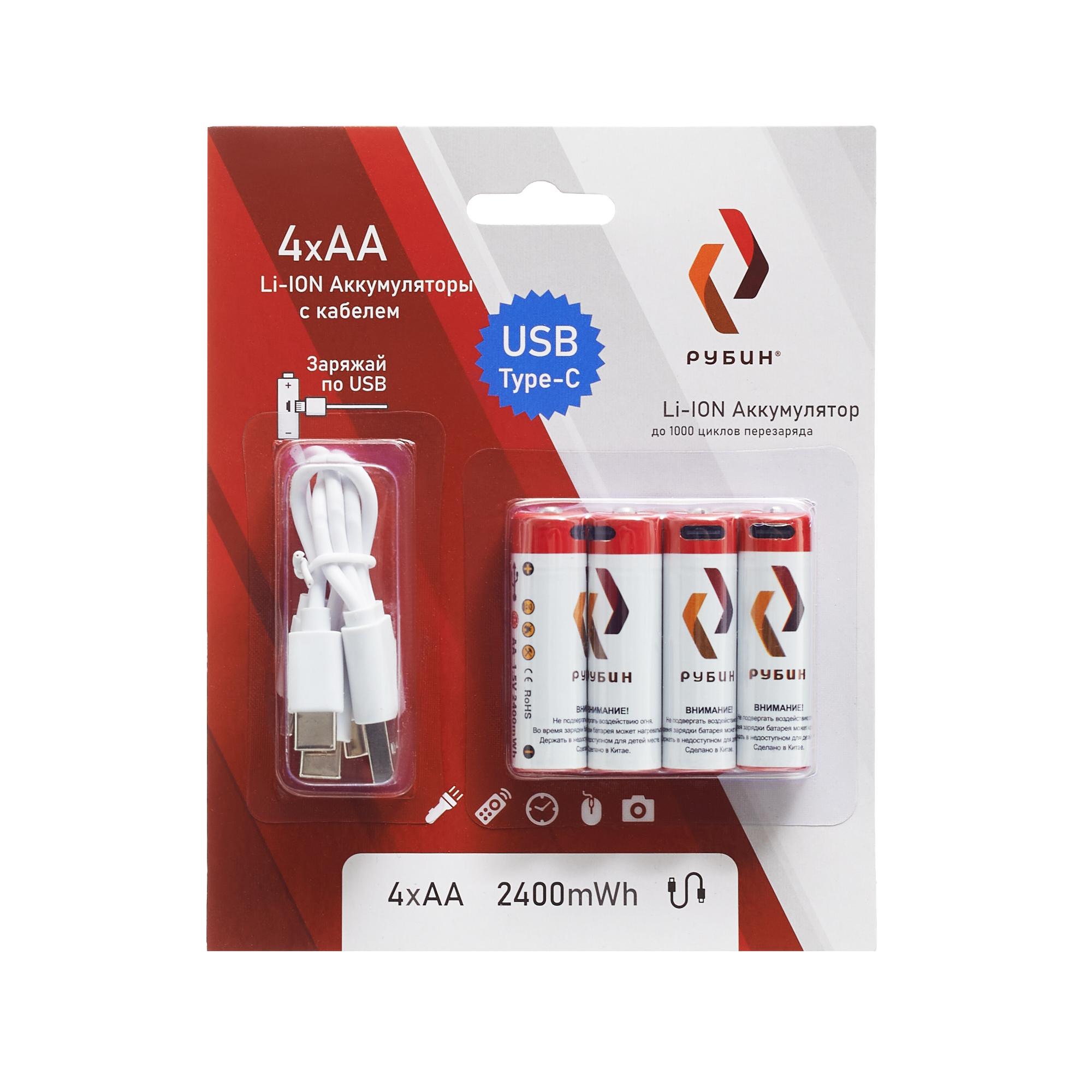 АА2400 Type-c блистер с кабелем 4шт Аккумуляторные пальчиковые батарейки Рубин Li-ion АА 1,5v 2400 mWh с Type-c зарядкой: экологичная и экономичная замена пальчиковым батарейкам. Продаются в упаковке по 4 штуки с кабелем для зарядки. Аккумуляторные батарейки Рубин решают проблему питания любых устройств, работающих от пальчиковых АА-батареек. Аккумулятор выдерживает до 1000 циклов зарядки: один аккумулятор заменяет 1000 батареек! Чтобы зарядить Рубин Li-ion АА 1,5v 2400 mWh, достаточно любого Type-c источника питания. В корпус аккумулятора уже встроен Type-c разъем, как в большинстве современных смартфонах — аккумулятор будет полностью готов к использованию через 1,5 часа. Больше никаких зарядных устройств, проводов и выброшенных батареек, вредящих экологи и! • Заряжается через любой Type c-выход • До 1000 циклов заряда/разряда • Встроенный LED-индикатор • Автоматическое отключение при полном уровне заряда • Вес: 20 г, размеры: 14 x 50 мм • Время зарядки: до 1,5 часов • Ёмкость: 1600 мАч, 1.5 В (60-80% от обычной одноразовой батарейки) • Условия работы: от 0 до +45°С, 10—85% RH • Условия хранения: от -10 до +60°С, 10—85% RH • Ток заряда: 400 мА; сила тока: 30 мА—400 мА Применяются в: 1. Детские интерактивные игрушки 2. Игрушки на радиоуправлении (кроме игрушек с бесколлекторным двигателем и приборов, требующих большой «пусковой ток») 3. Карманные фонарики 4. Пульты дистанционного управления. 5. Настенные часы 6. Домашние электроприборы. 7. Портативные аудио-видео устройства. 8. Носимые устройства связи (радиостанции, walkie-talkie).