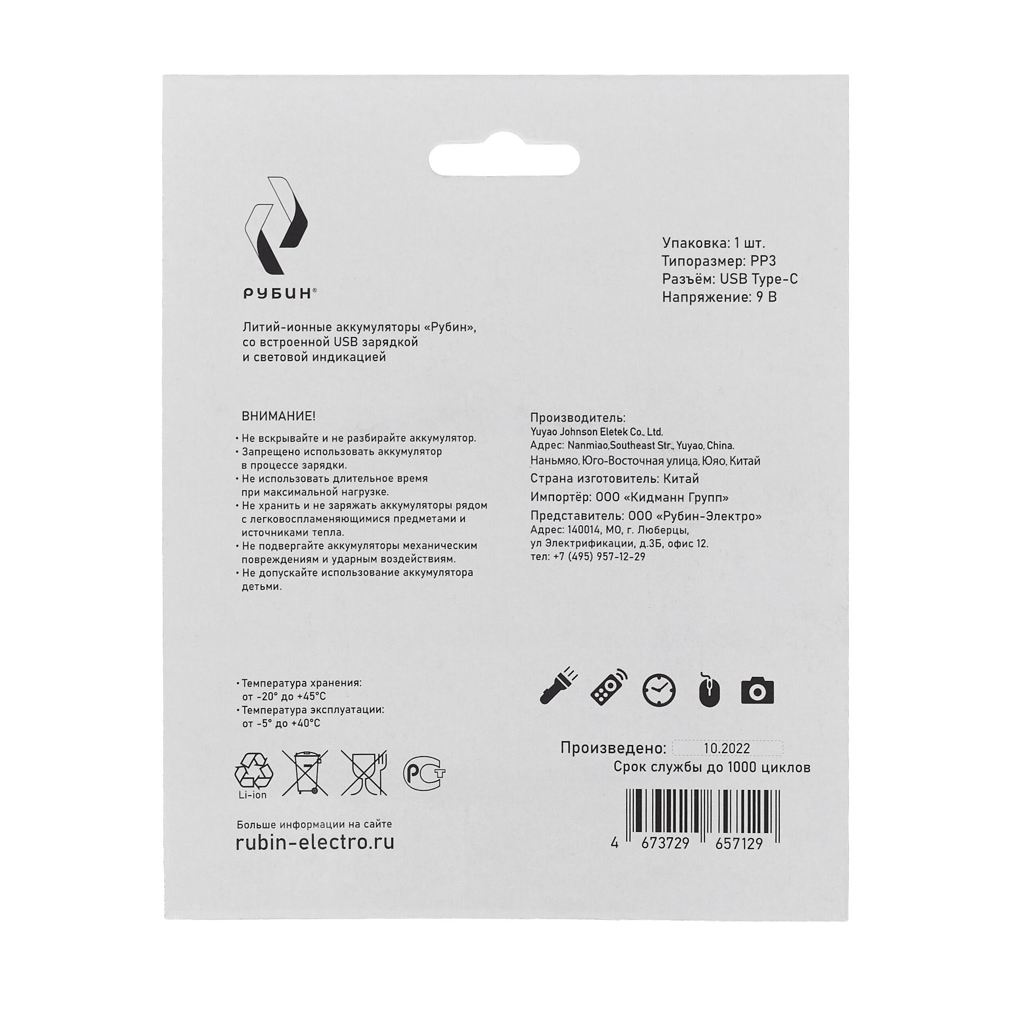 Крона 4500 Type-c блистер Аккумуляторные батарейки Крона Рубин Li-ion 9v 4500 mWh с Type-c зарядкой: экологичная и экономичная замена Крона-батарейкам. Аккумуляторные батарейки Рубин решают проблему питания любых устройств, работающих от Крона-батареек. Аккумулятор выдерживает до 1000 циклов зарядки: один аккумулятор заменяет 1000 батареек! Чтобы зарядить Крона Рубин Li-ion 9v 4500 mWh, достаточно любого USB (5В) источника питания. В корпус аккумулятора уже встроен Type-c разъем, как в большинстве современных смартфонах — аккумулятор будет полностью готов к использованию через 1,5 часа. Больше никаких зарядных устройств, проводов и выброшенных батареек, вредящих экологии! • Заряжается через любой USB-выход • До 1000 циклов заряда/разряда • Встроенный LED-индикатор • Автоматическое отключение при полном уровне заряда • Вес: 16 г, размеры: 26 x 47 мм • Время зарядки: до 1,5 часов • Ёмкость: 500 мАч, 9 В (60-80% от обычной одноразовой батарейки) • Условия работы: от 0 до +45°С, 10—85% RH • Условия хранения: от -10 до +60°С, 10—85% RH • Ток заряда: 400 мА; сила тока: 30 мА—400 мА Применяются в: 1. Детские интерактивные игрушки 2. Игрушки на радиоуправлении (кроме игрушек с бесколлекторным двигателем и приборов, требующих большой «пусковой ток») 3. Домашние электроприборы. 4. Портативные аудио-видео устройства. 5. Носимые устройства связи (радиостанции, walkie-talkie). 6. Мультиметры и тестеры