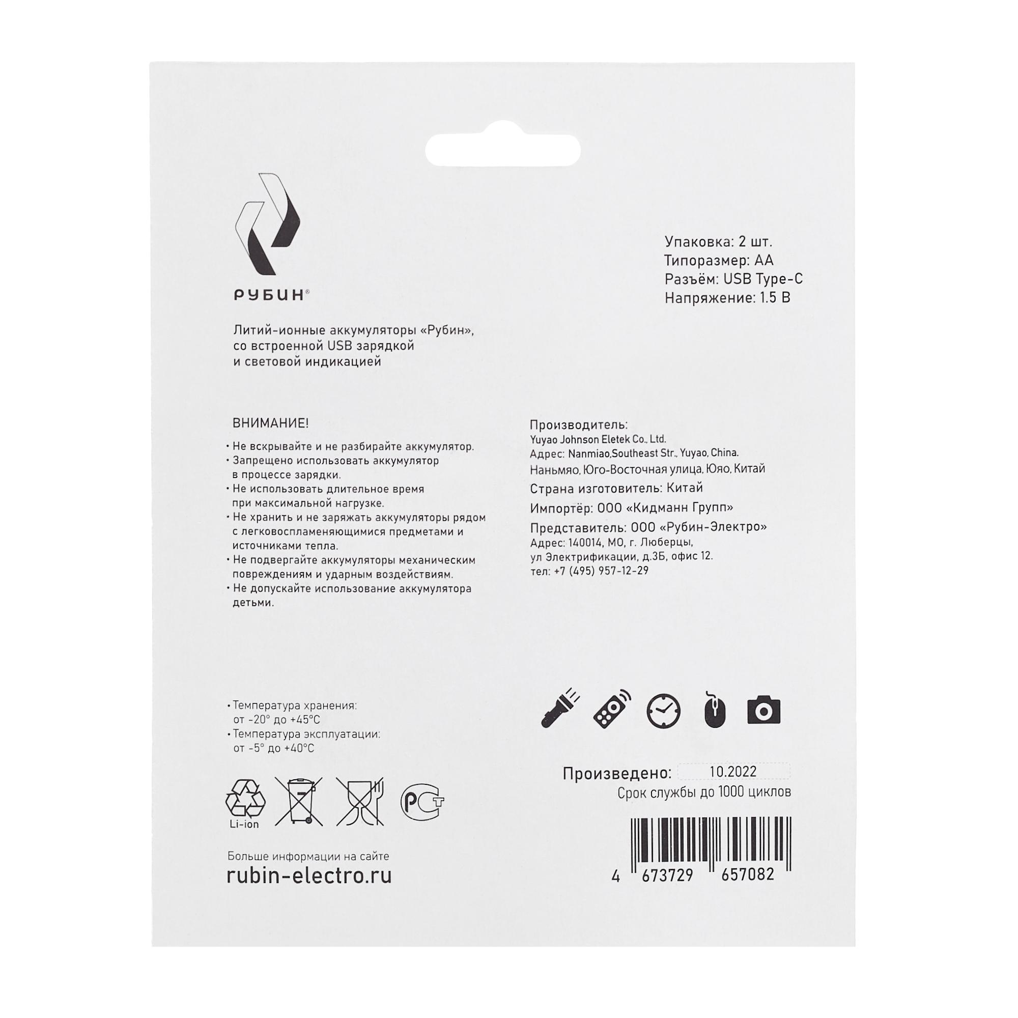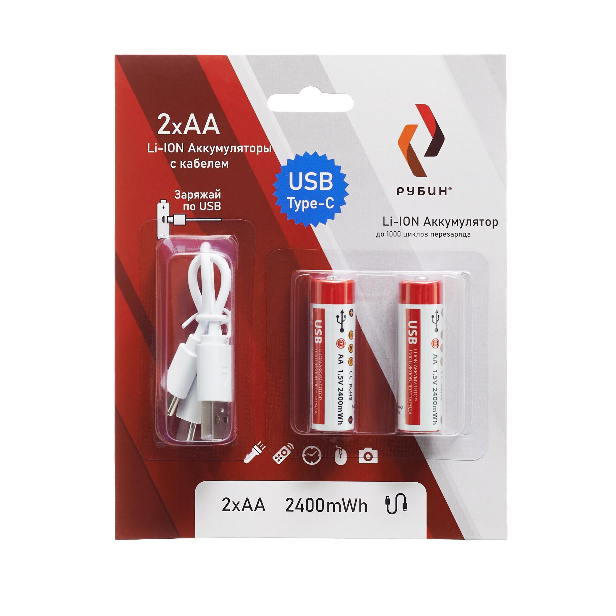 АА2400 Type-c блистер с кабелем 2шт Аккумуляторные пальчиковые батарейки Рубин Li-ion АА 1,5v 2400 mWh с Type-c зарядкой: экологичная и экономичная замена пальчиковым батарейкам. Продаются в упаковке по 2 штуки с кабелем для зарядки. Аккумуляторные батарейки Рубин решают проблему питания любых устройств, работающих от пальчиковых АА-батареек. Аккумулятор выдерживает до 1000 циклов зарядки: один аккумулятор заменяет 1000 батареек! Чтобы зарядить Рубин Li-ion АА 1,5v 2400 mWh, достаточно любого Type-c источника питания. В корпус аккумулятора уже встроен Type-c разъем, как в большинстве современных смартфонах — аккумулятор будет полностью готов к использованию через 1,5 часа. Больше никаких зарядных устройств, проводов и выброшенных батареек, вредящих экологии! • Заряжается через любой Type c-выход • До 1000 циклов заряда/разряда • Встроенный LED-индикатор • Автоматическое отключение при полном уровне заряда • Вес: 20 г, размеры: 14 x 50 мм • Время зарядки: до 1,5 часов • Ёмкость: 1600 мАч, 1.5 В (60-80% от обычной одноразовой батарейки) • Условия работы: от 0 до +45°С, 10—85% RH • Условия хранения: от -10 до +60°С, 10—85% RH • Ток заряда: 400 мА; сила тока: 30 мА—400 мА Применяются в: 1. Детские интерактивные игрушки 2. Игрушки на радиоуправлении (кроме игрушек с бесколлекторным двигателем и приборов, требующих большой «пусковой ток») 3. Карманные фонарики 4. Пульты дистанционного управления. 5. Настенные часы 6. Домашние электроприборы. 7. Портативные аудио-видео устройства. 8. Носимые устройства связи (радиостанции, walkie-talkie).