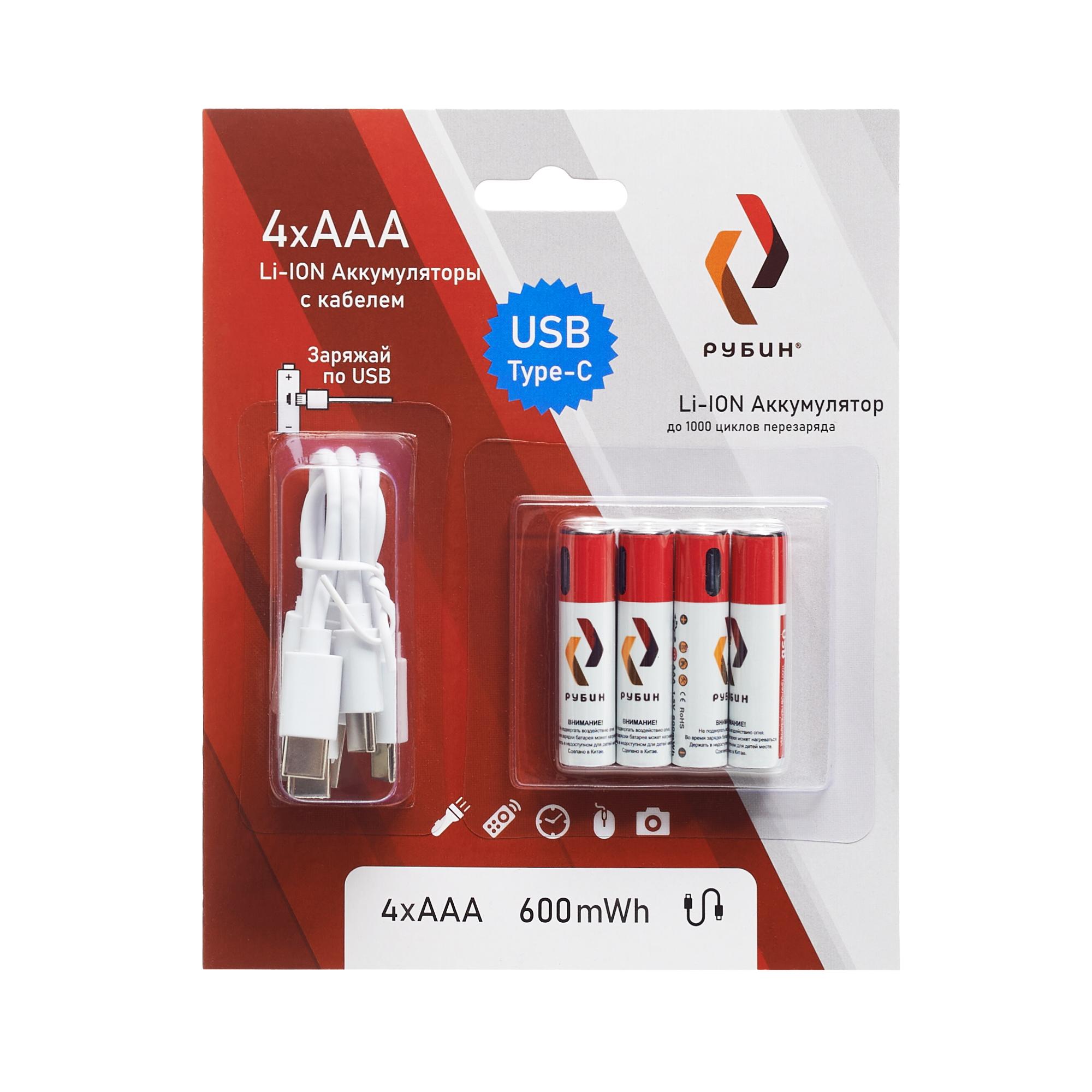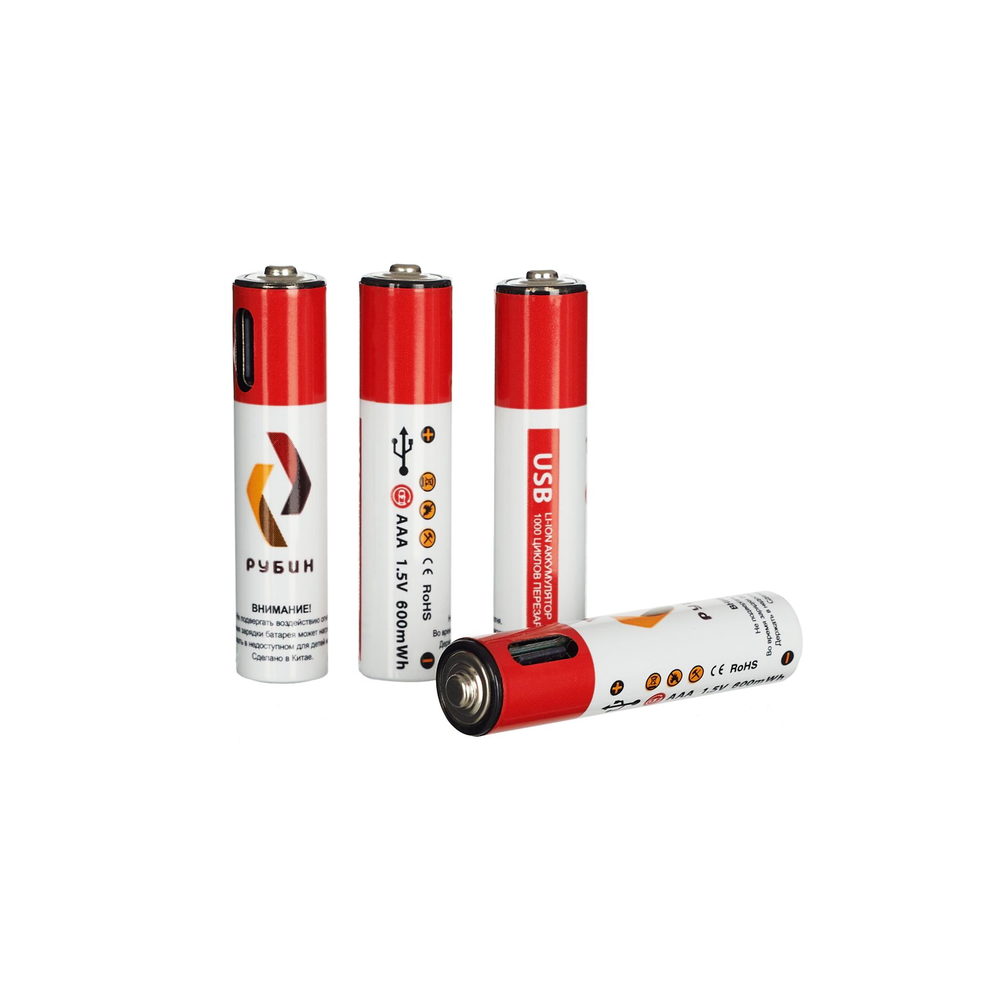 ААА600 Type-c блистер с кабелем 4шт Аккумуляторные мизинчиковые батарейки Рубин Li-ion ААA 1,5v 600 mWh с Type-c зарядкой: экологичная и экономичная замена мизинчиковым батарейкам. Продаются в упаковке по 4 штуки с кабелем для зарядки. Аккумуляторные батарейки Рубин решают проблему питания любых устройств, работающих от мизинчиковых ААА-батареек. Аккумулятор выдерживает до 1000 циклов зарядки: один аккумулятор заменяет 1000 батареек! Чтобы зарядить Рубин Li-ion ААA 1,5v 600 mWh, достаточно любого USB (5В) источника питания. В корпус аккумулятора уже встроен Type-c разъем, как в большинстве современных смартфонах — аккумулятор будет полностью готов к использованию через 1,5 часа. Больше никаких зарядных устройств, проводов и выброшенных батареек, вредящих экологии! • Заряжается через любой USB-выход • До 1000 циклов заряда/разряда • Встроенный LED-индикатор • Автоматическое отключение при полном уровне заряда • Вес: 10 г, размеры: 10 x 44 мм • Время зарядки: до 1,5 часов • Ёмкость: 400 мАч, 1.5 В (60-80% от обычной одноразовой батарейки) • Условия работы: от 0 до +45°С, 10—85% RH • Условия хранения: от -10 до +60°С, 10—85% RH • Ток заряда: 400 мА; сила тока: 30 мА—400 мА Применяются в: 1. Детские интерактивные игрушки 2. Игрушки на радиоуправлении (кроме игрушек с бесколлекторным двигателем и приборов, требующих большой «пусковой ток») 3. Карманные фонарики 4. Пульты дистанционного управления. 5. Настенные часы 6. Домашние электроприборы. 7. Портативные аудио-видео устройства. 8. Носимые устройства связи (радиостанции, walkie-talkie).