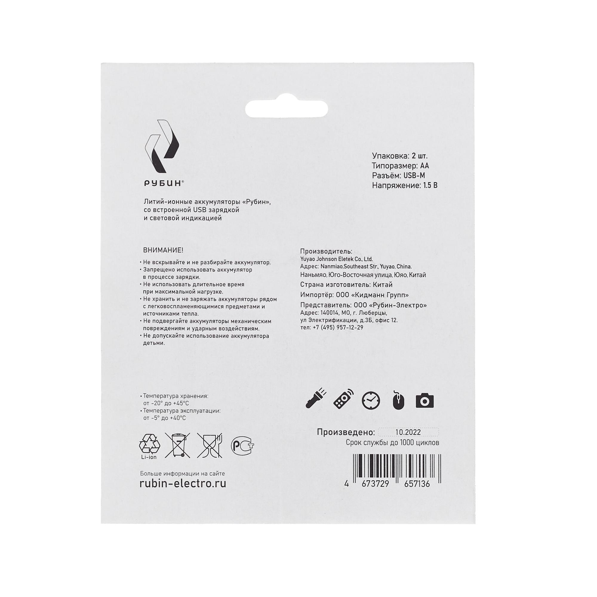 АА1800 USB блистер Аккумуляторные пальчиковые батарейки Рубин Li-ion АA 1,5v 1800 mWh с USB-зарядкой: экологичная и экономичная замена пальчиковым батарейкам. Аккумуляторные батарейки Рубин решают проблему питания любых устройств, работающих от пальчиковых АА-батареек Аккумулятор выдерживает до 1000 циклов зарядки: один аккумулятор заменяет 1000 батареек! Чтобы зарядить Рубин Li-ion АA 1,5v 1800 mWh, просто снимите колпачок и вставьте аккумулятор в USB-разъём — он будет полностью готов к использованию через 3 часа. Больше никаких зарядных устройств, проводов и выброшенных батареек, вредящих экологии! • Заряжается через любой USB-выход • До 1000 циклов заряда/разряда • Встроенный LED-индикатор • Автоматическое отключение при полном уровне заряда • Вес: 20 г, размеры: 14 x 50 мм • Время зарядки: до 3 часов • Ёмкость: 1200 мАч, 1.5 В (60-80% от обычной одноразовой батарейки) • Условия работы: от 0 до +45°С, 10—85% RH • Условия хранения: от -10 до +60°С, 10—85% RH • Ток заряда: 400 мА; сила тока: 30 мА—400 мА Применяются в: 1. Детские интерактивные игрушки 2. Игрушки на радиоуправлении 3. Карманные фонарики 4. Пульты дистанционного управления. 5. Настенные часы 6. Домашние электроприборы. 7. Портативные аудио-видео устройства. 8. Носимые устройства связи (радиостанции, walkie-talkie).