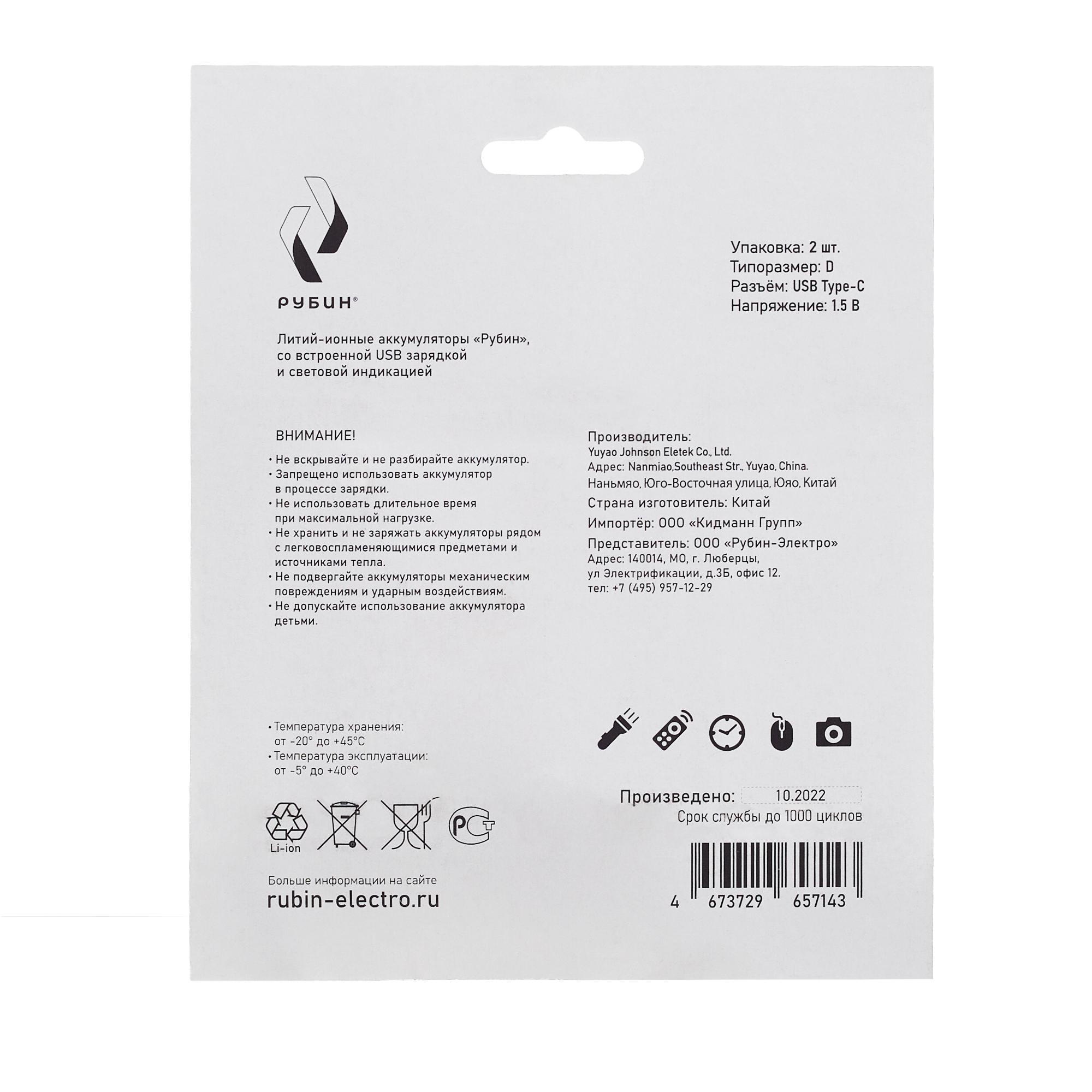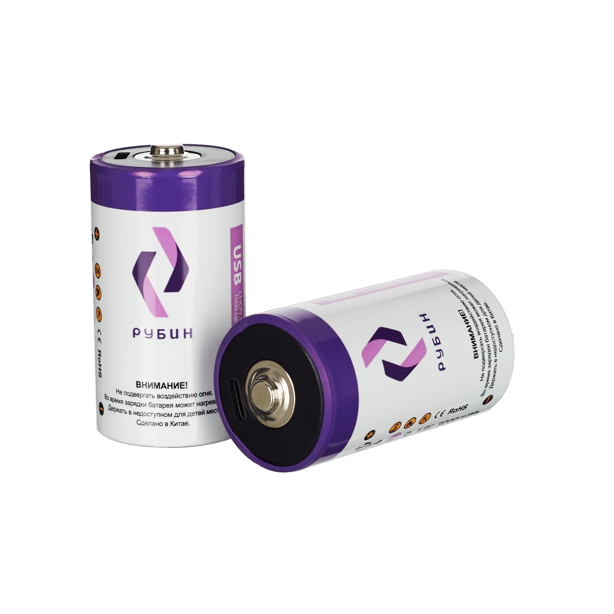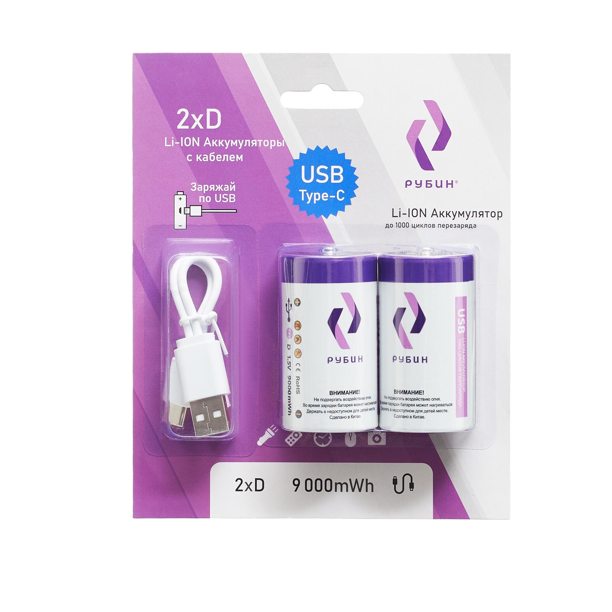 D 9000 Type-c блистер с кабелем 2шт Аккумуляторные батарейки Рубин Li-ion D 1,5v 9000 mWh с Type-c зарядкой: экологичная и экономичная замена D-батарейкам. Продаются в упаковке по 2 штуки с кабелем для зарядки. Аккумуляторные батарейки Рубин решают проблему питания любых устройств, работающих от D-батареек. Аккумулятор выдерживает до 1000 циклов зарядки: один аккумулятор заменяет 1000 батареек! Чтобы зарядить Рубин Li-ion D 1,5v 9000 mWh, достаточно любого USB (5В) источника питания. В корпус аккумулятора уже встроен Type-c разъем, как в большинстве современных смартфонах — аккумулятор будет полностью готов к использованию через 1,5 часа. Больше никаких зарядных устройств, проводов и выброшенных батареек, вредящих экологии! • Заряжается через любой USB-выход • До 1000 циклов заряда/разряда • Встроенный LED-индикатор • Автоматическое отключение при полном уровне заряда • Вес: 140 г, размеры: 35 x 62 мм • Время зарядки: до 1,5 часов • Ёмкость: 6000 мАч, 1,5 В (60-80% от обычной одноразовой батарейки) • Условия работы: от 0 до +45°С, 10—85% RH • Условия хранения: от -10 до +60°С, 10—85% RH • Ток заряда: 400 мА; сила тока: 30 мА—400 мА Применяются в: 1. Детские интерактивные игрушки 2. Игрушки на радиоуправлении (кроме игрушек с бесколлекторным двигателем и приборов, требующих большой «пусковой ток») 3. Домашние электроприборы. 4. Портативные аудио-видео устройства. 5. Носимые устройства связи (радиостанции, walkie-talkie). 6. Мультиметры и тестеры
